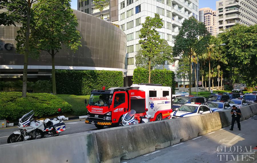 Singaporean police stand at a checkpoint set up outside the St. Regis Hotel on Sunday where DPRK leader Kim Jong-un is staying. (Photo: Yang Sheng/GT)