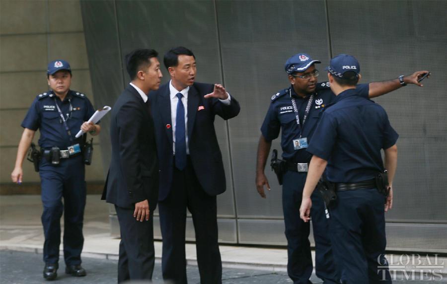 Related staffs coordinate security matters with the police outside the St. Regis hotel where DPRK leader Kim Jong-un has stayed in Singapore on Sunday. (Photo: Yang Sheng/GT)