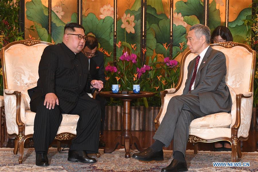 Singaporean Prime Minister Lee Hsien Loong (R) meets with Kim Jong Un, chairman of the Workers' Party of Korea (WPK) and chairman of the State Affairs Commission of the Democratic People's Republic of Korea (DPRK), in Singapore, on June 10, 2018. (Xinhua/Then Chih Wey)