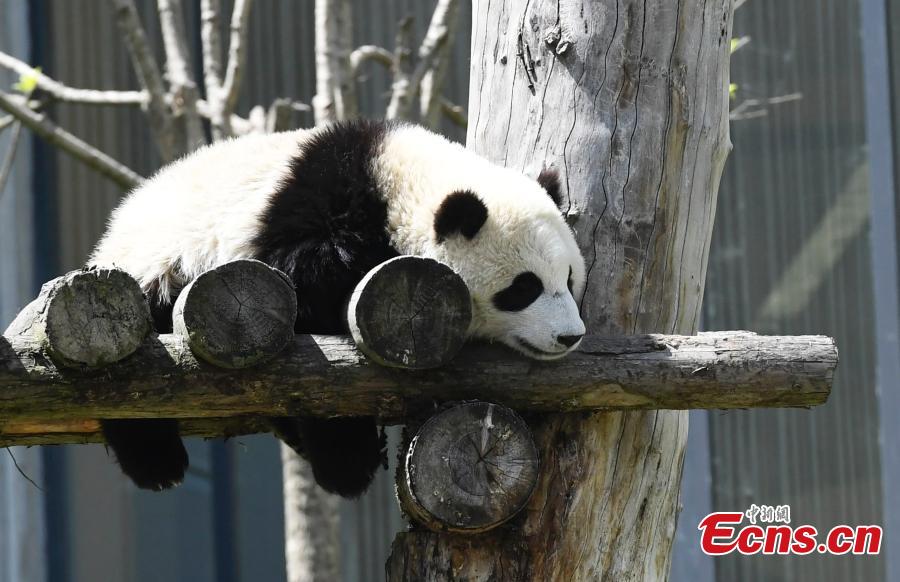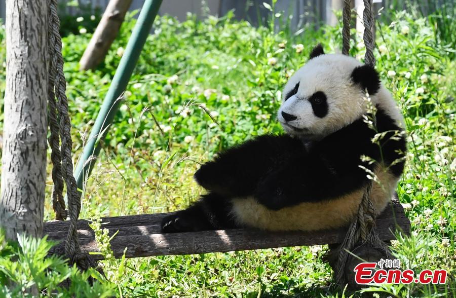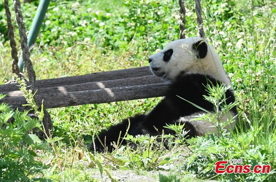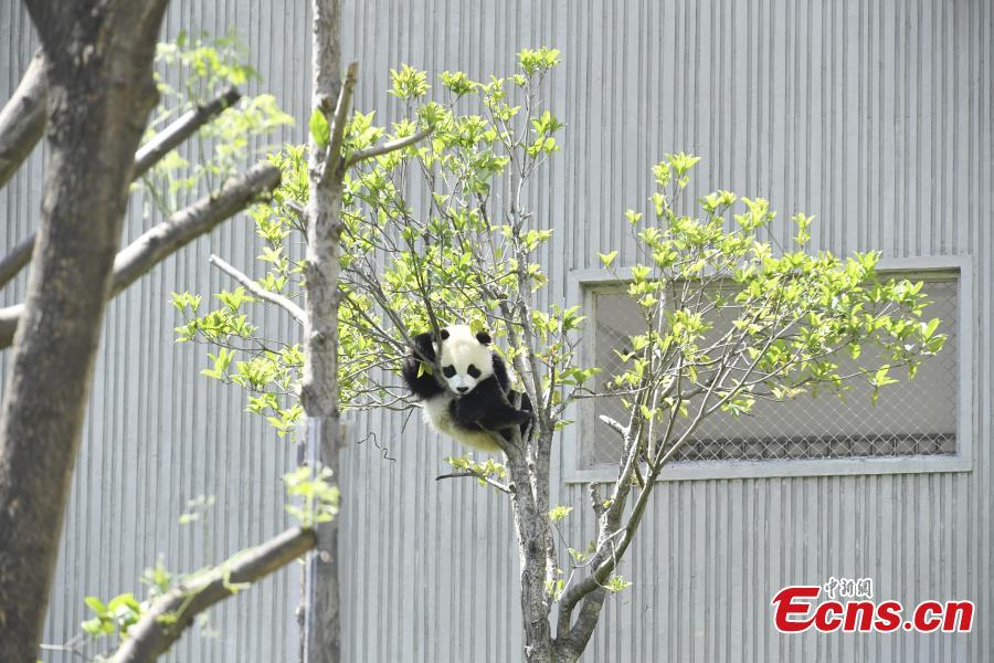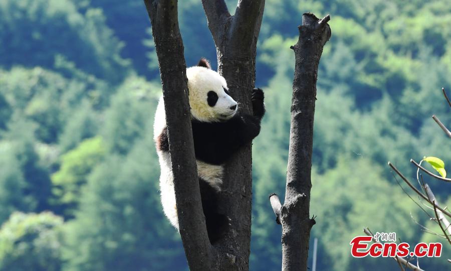 Photo taken on June 10, 2018 shows a giant panda born last year at the China Conservation and Research Center for the Giant Panda plays on a sunny day. (Photo: China News Service/An Yuan)