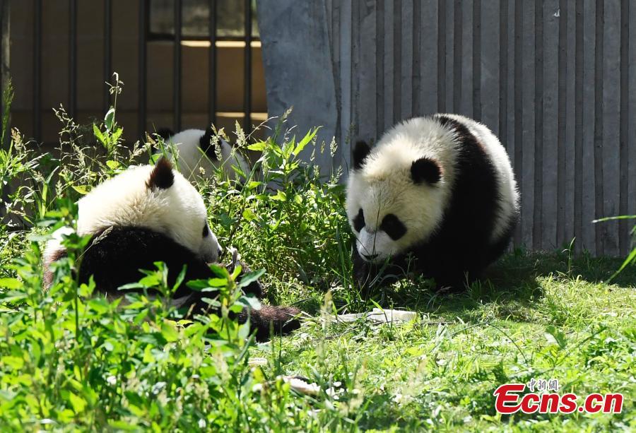 Photo taken on June 10, 2018 shows giant pandas born this year at the China Conservation and Research Center for the Giant Panda play on a sunny day. (Photo: China News Service/An Yuan)