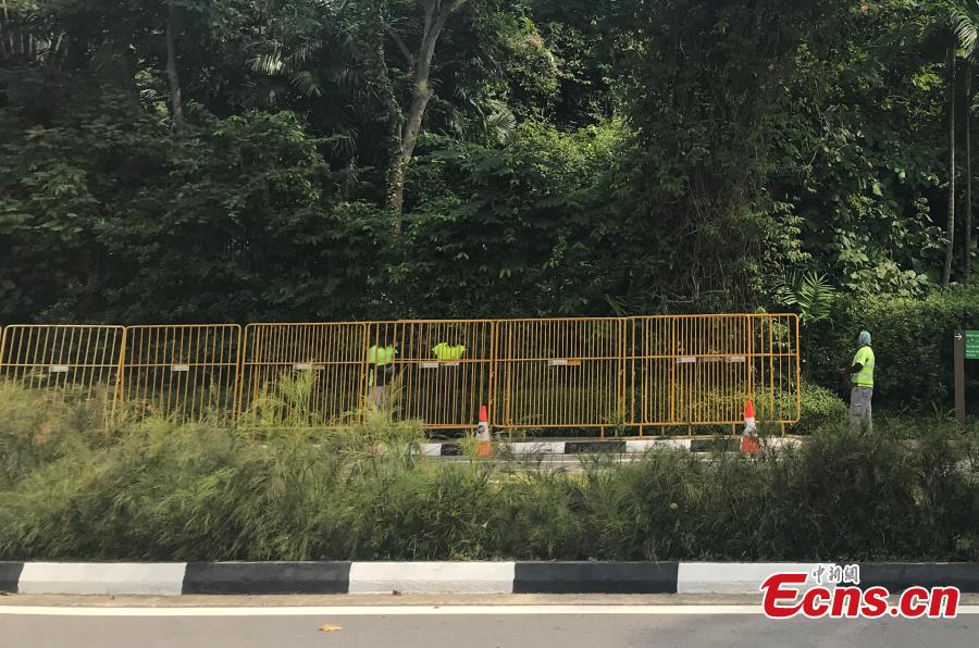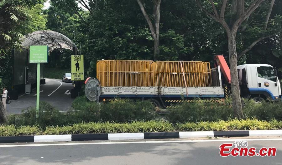 Workers erect a fence near the Capella Resort on Sentosa Island, Singapore, June 10, 2018. (Photo: China News Service/Meng Xiangjun)