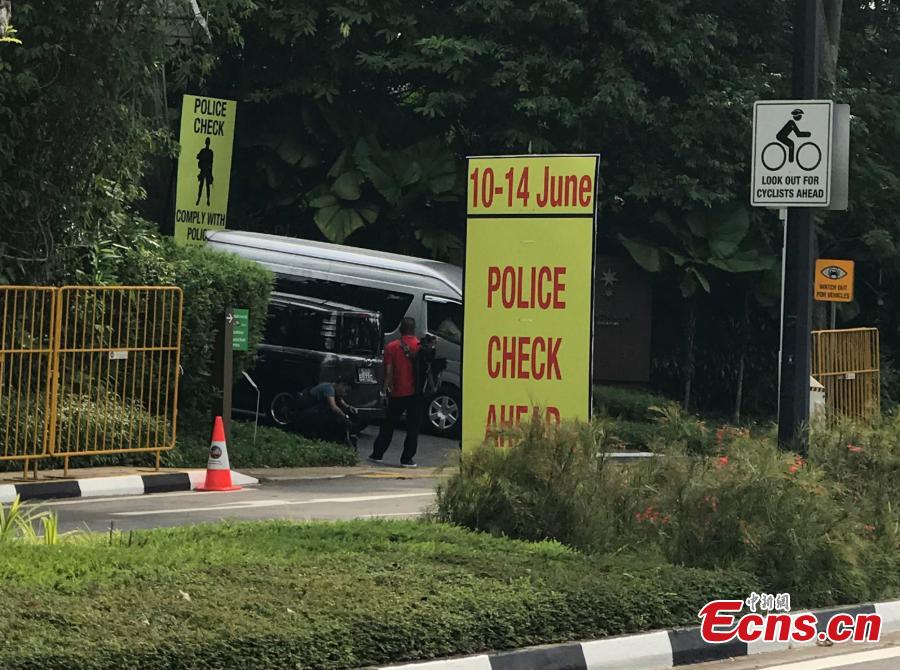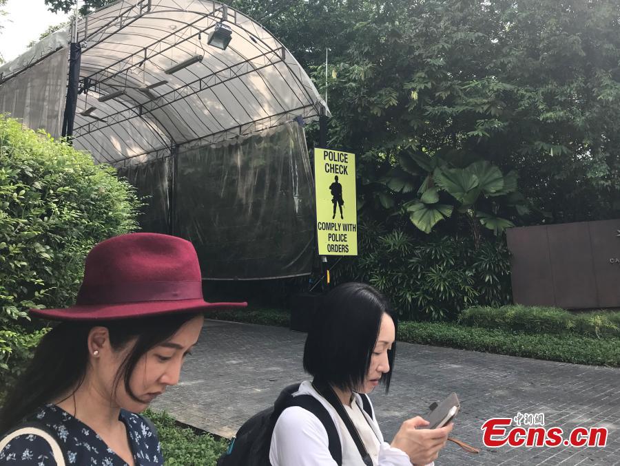 A sign for a police check stands near the Capella Resort on Sentosa Island, Singapore, June 10, 2018. (Photo: China News Service/Meng Xiangjun)