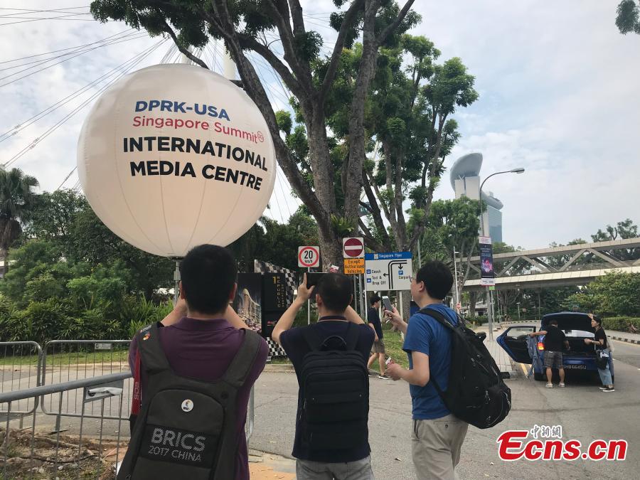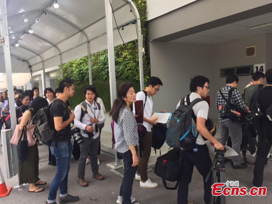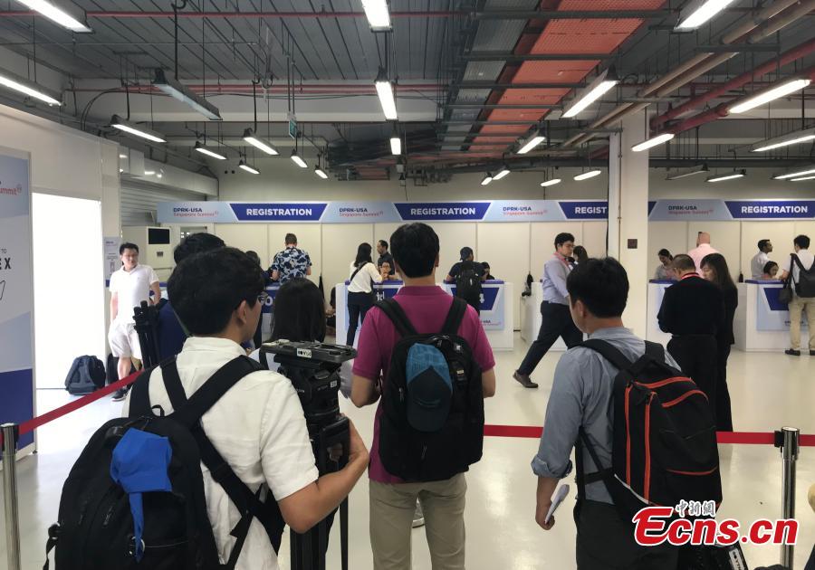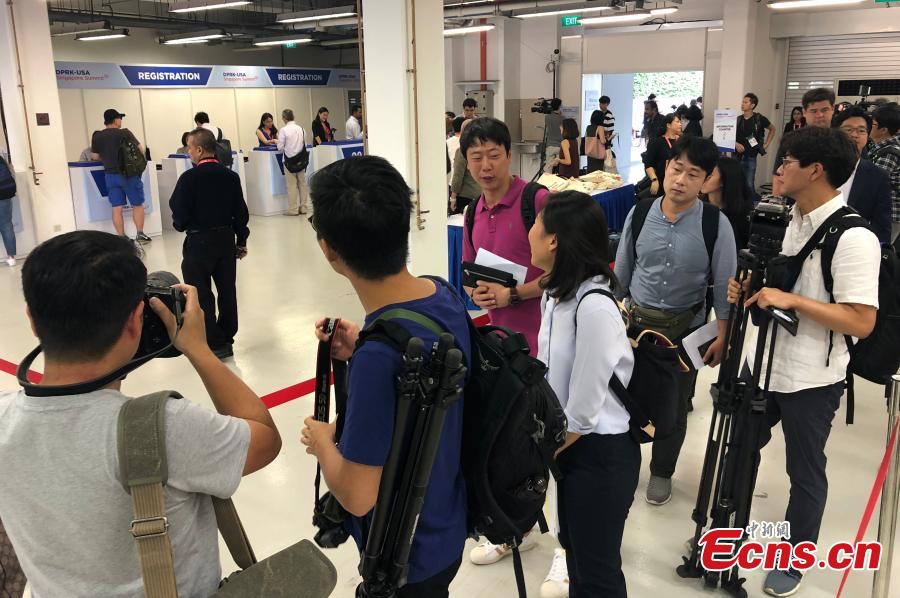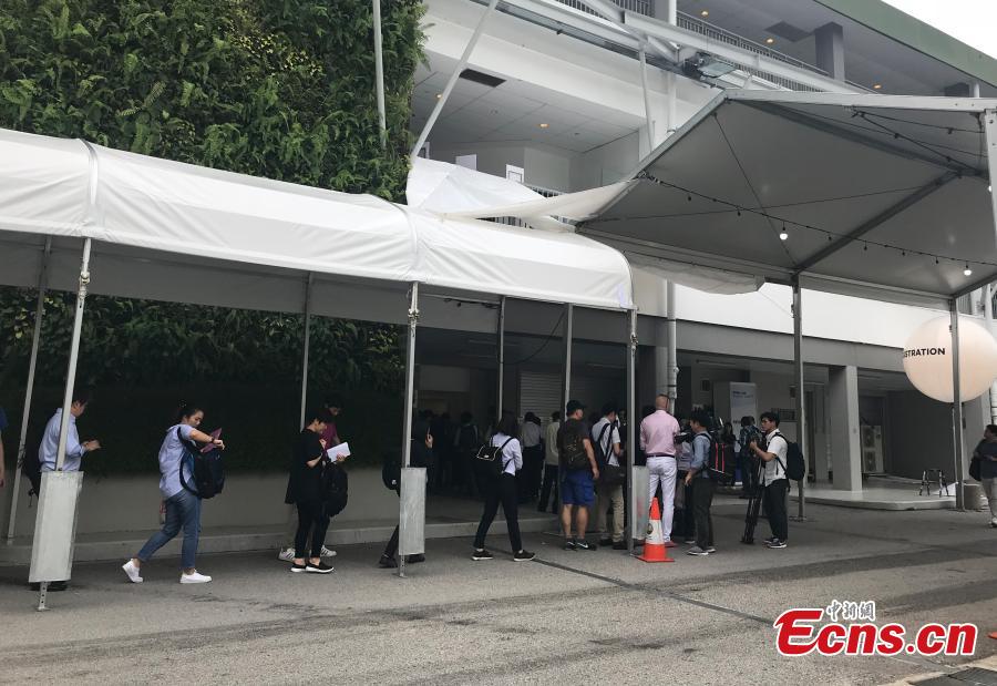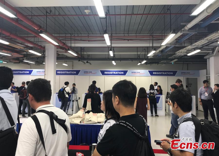 Reporters queue to enter the International Media Center for the DPRK-USA summit at F1 Pit Building in Singapore, June 10, 2018. (Photo: China News Service/Li Yang)