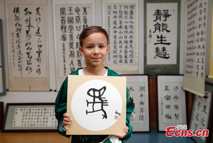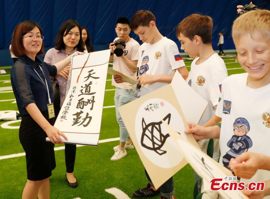 A Russian teenager ice hockey player shows a Chinese calligraphy work during a visit to Beijing Huijia Private School in Beijing, June 11, 2018. (Photo: China News Service/Liu Guanguan)