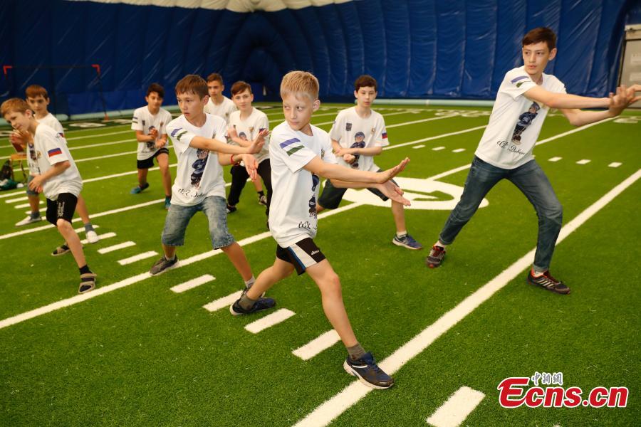 Russian teenager ice hockey players learn about kung fu during a visit to Beijing Huijia Private School in Beijing, June 11, 2018. (Photo: China News Service/Liu Guanguan)