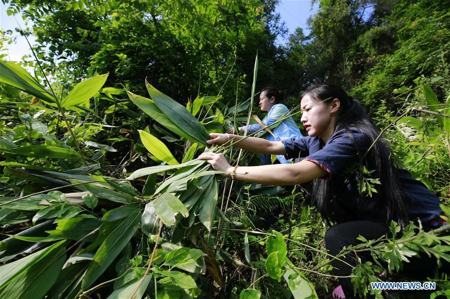 People pick leaves to make Zongzi, a pyramid-shaped dumpling made of glutinous rice wrapped in bamboo or reed leaves, to greet the upcoming Dragon Boat Festival in forest of Zhangjiajie City, central China's Hunan Province, June 11, 2018. (Xinhua/Wu Yongbing)