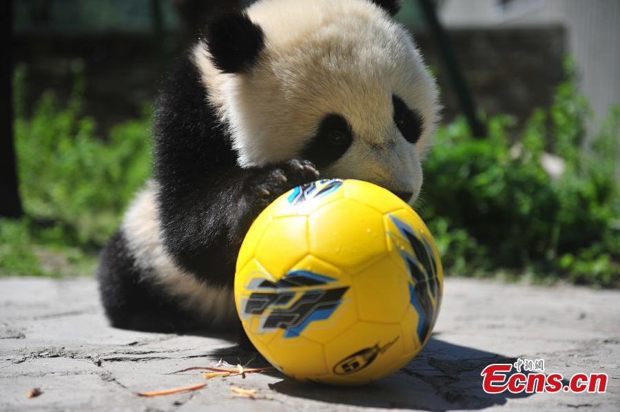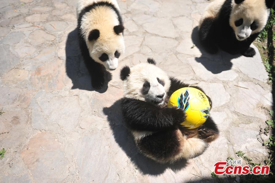 Giant pandas play football at Wolong Shenshuping Base of China Conservation and Research Center for Giant Pandas in Ngawa Tibetan and Qiang Autonomous Prefecture, Southwest China’s Sichuan Province. Eight pandas, all born in 2017, will participate in six events during the World Cup from June 14 to July 15 on iPanda.com, China's giant panda cam TV channel, according to the center. (Photo/VCG)