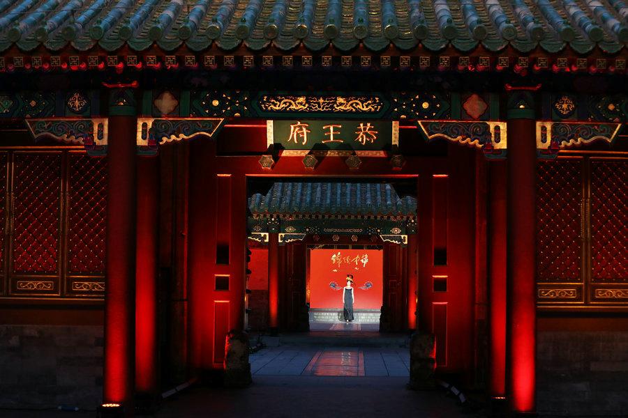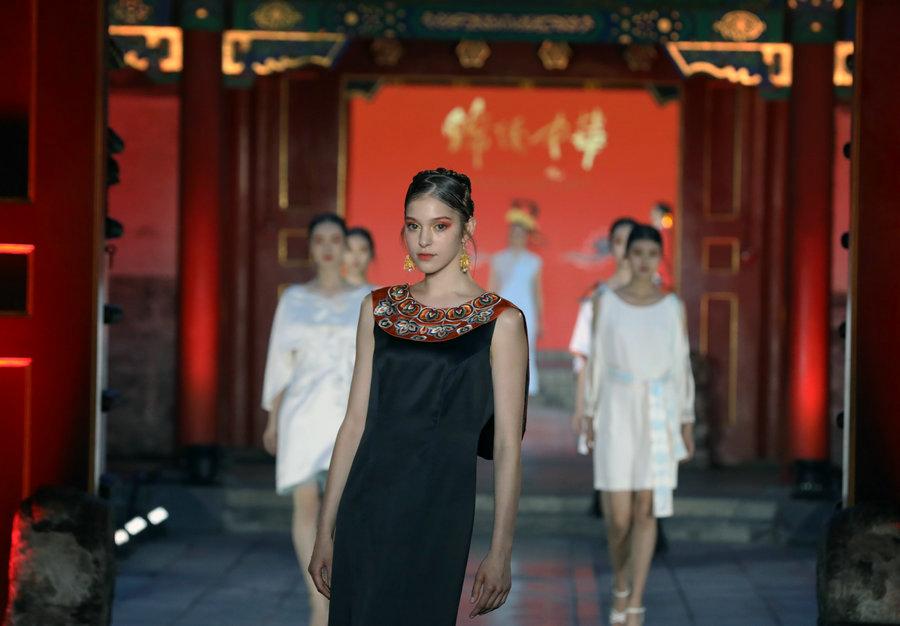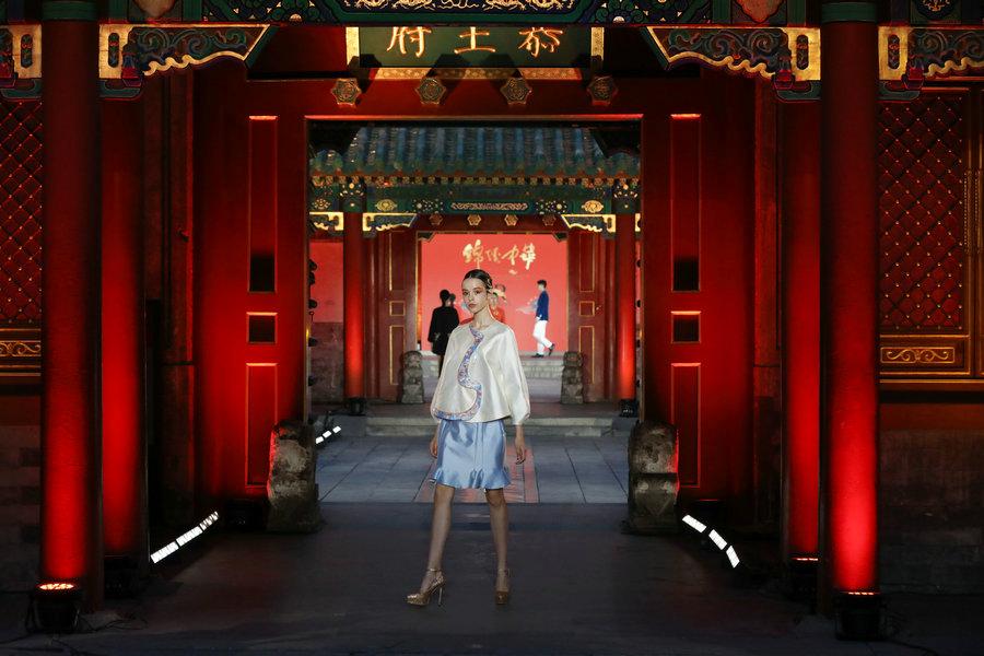 A model presents a design by D.Rita at the Prince Kung's Mansion in Beijing, June 8, 2018. The runway is a part of "Splendid China: China Intangible Cultural Heritage Fashion Show", one activity of the 2018 Cultural and Natural Heritage Day. (Photo/China Daily)