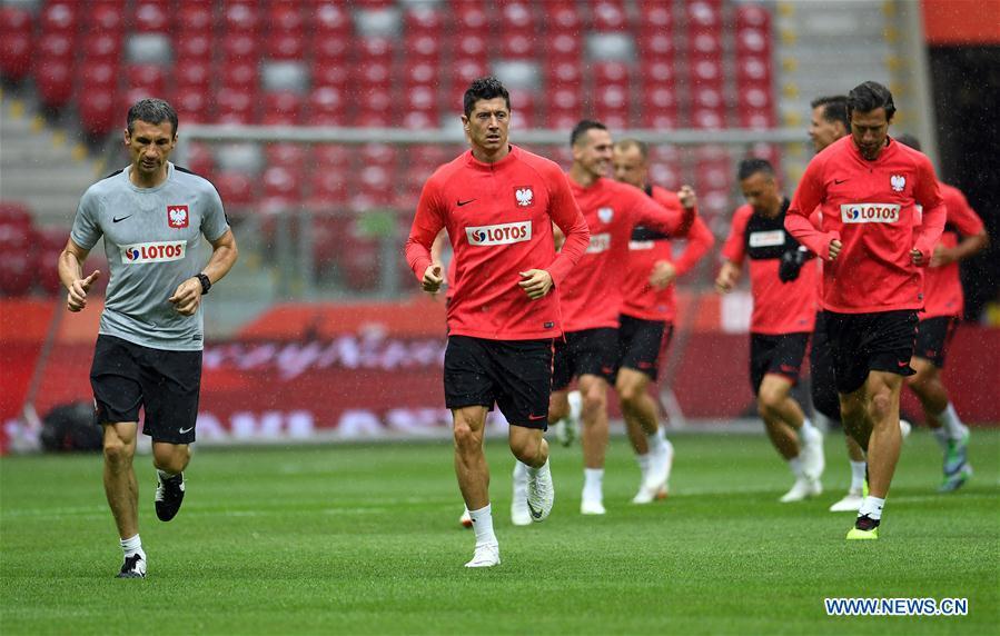Poland's Robert Lewandowski (L Front) attends a training session ahead of the 2018 Russia World Cup, in Warsaw, Poland, on June 11, 2018. (Xinhua/Maciej Gillert)