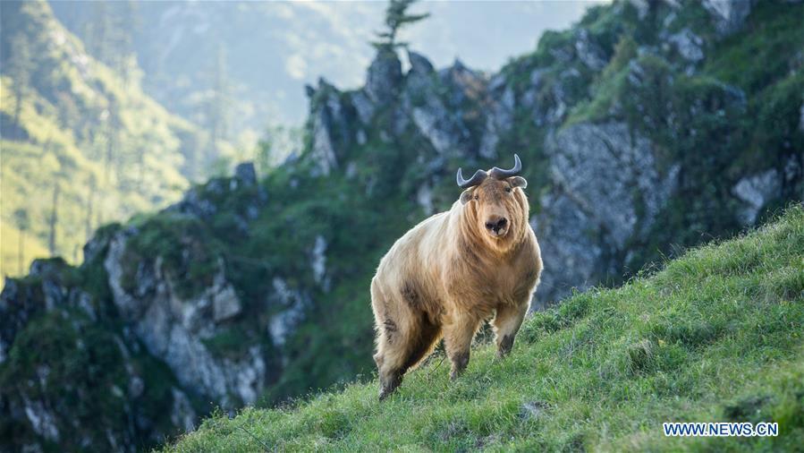 A takin is seen in mountainous region of Foping County, northwest China's Shaanxi Province, June 9, 2018. The number of the rare animal takin is rising under protection and environment improvement. (Xinhua/Zhao Jianqiang)