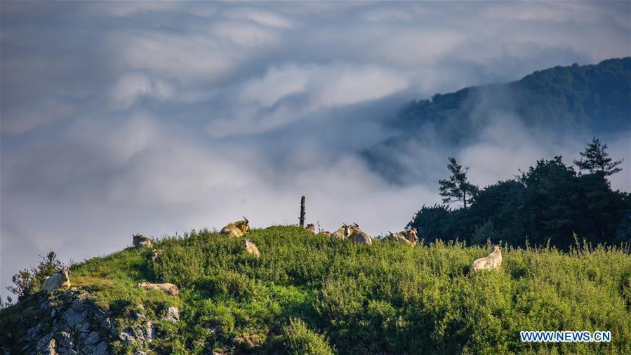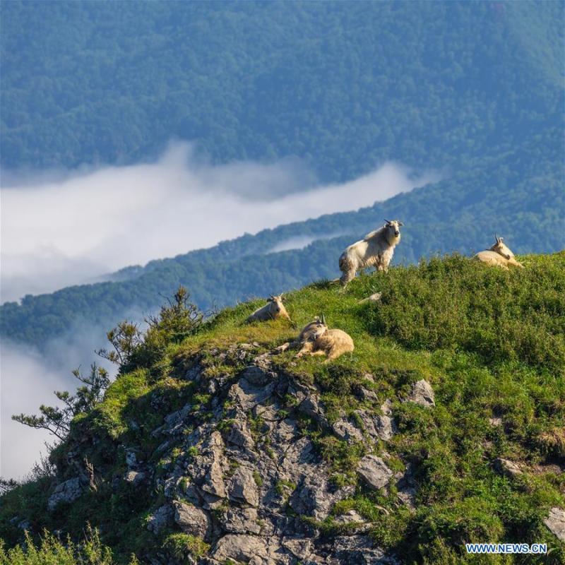 Takins are seen in mountainous region of Foping County, northwest China's Shaanxi Province, June 9, 2018. The number of the rare animal takin is rising under protection and environment improvement. (Xinhua/Zhao Jianqiang)