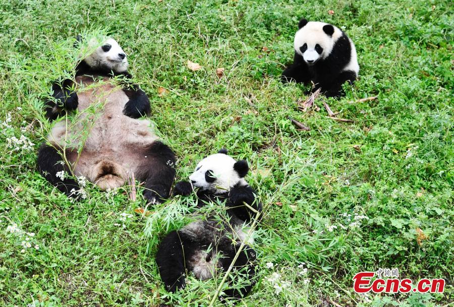 Giant panda Haizi and its twin cubs play at the Dujiangyan Base of China Conservation and Research Center for Giant Pandas in Southwest China’s Sichuan Province, June 19, 2018. (Photo: China News Service/An Yuan)