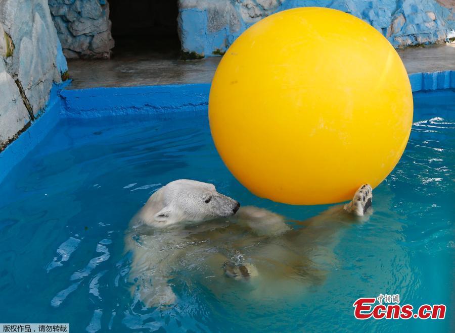 Aurora, an eight-year-old female polar bear, plays with a ball in a pool during a hot summer day at the Royev Ruchey zoo in Krasnoyarsk, Russia. (Photo/Agencies)