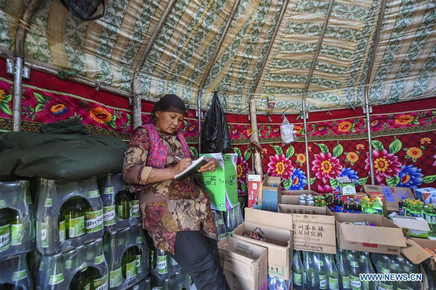 1A store owner keeps accounts at the summer pasture on the Barlik Mountain in Yumin County, northwest China's Xinjiang Uygur Autonomous Region, June 22, 2018. Local herdsmen have transferred their livestock to summer pastures on the Barlik Mountain since late June and will stay here until September. Local authorities has devoted efforts in recent years to protect the ecological environment on the pasture and upgrade driveways to improve the infrastructure construction in the pasturing area. (Xinhua/Hu Huhu)