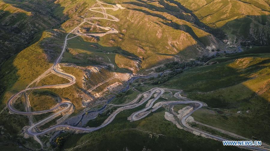Aerial photo taken on June 22, 2018 shows a driveway on the Barlik Mountain in Yumin County, northwest China's Xinjiang Uygur Autonomous Region. Local herdsmen have transferred their livestock to summer pastures on the Barlik Mountain since late June and will stay here until September. Local authorities has devoted efforts in recent years to protect the ecological environment on the pasture and upgrade driveways to improve the infrastructure construction in the pasturing area. (Xinhua/Hu Huhu)