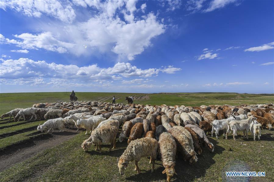 Herdsmen take their sheep to graze at the summer pasture on the Barlik Mountain in Yumin County, northwest China's Xinjiang Uygur Autonomous Region, June 22, 2018. Local herdsmen have transferred their livestock to summer pastures on the Barlik Mountain since late June and will stay here until September. Local authorities has devoted efforts in recent years to protect the ecological environment on the pasture and upgrade driveways to improve the infrastructure construction in the pasturing area. (Xinhua/Hu Huhu)