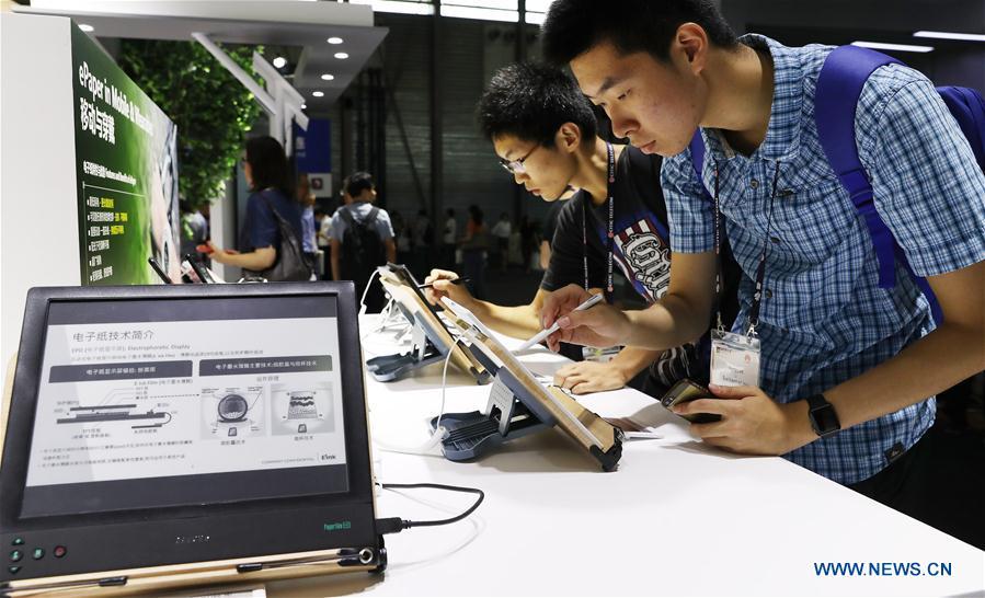 Visitors try out electronic ink devices during the Mobile World Conference Shanghai (MWCS) 2018 in east China's Shanghai, June 27, 2018. The three-day MWCS 2018 kicked off at the Shanghai New International Expo Center on Wednesday, showing trending mobile products, services and technologies. (Xinhua/Fang Zhe)