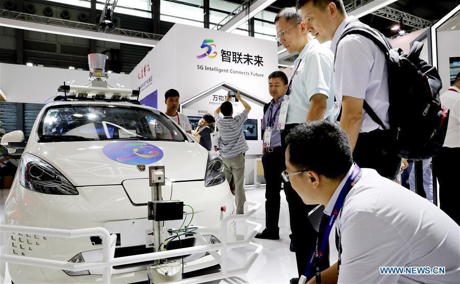 Visitors look at a wireless network device on a driverless car during the Mobile World Conference Shanghai (MWCS) 2018 in east China's Shanghai, June 27, 2018. The three-day MWCS 2018 kicked off at the Shanghai New International Expo Center on Wednesday, showing trending mobile products, services and technologies. (Xinhua/Fang Zhe)