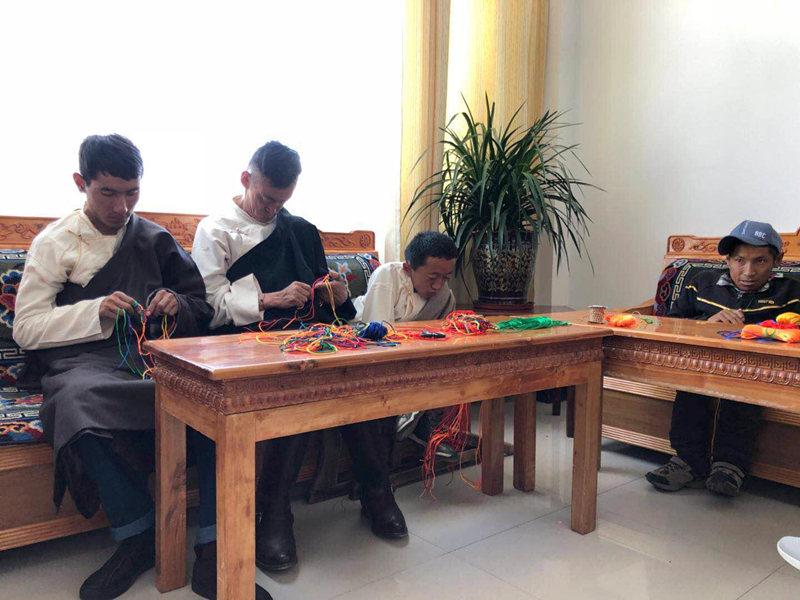People with disabilities weave Tibetan knot at a welfare center in Lhasa, Tibet autonomous region, June 20, 2018. By making some handicrafts, these people can earn money to support their families. (Photo provided to chinadaily.com.cn)