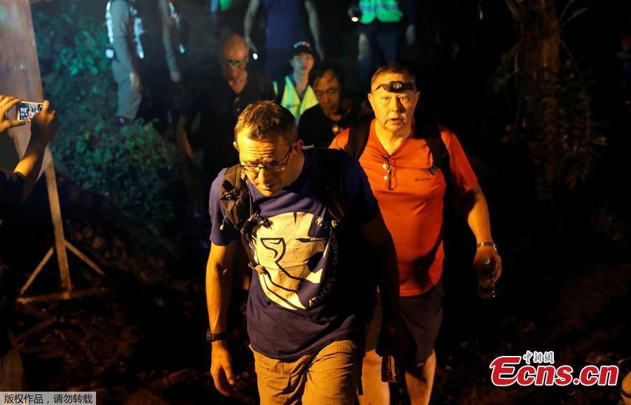 British divers John Volanthen and Robert Charles Harper leave after they checked the Tham Luang caves during a search for the members of an under-16 soccer team and their coach, in the northern province of Chiang Rai, Thailand, June 27, 2018. (Photo/Agencies)