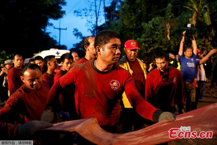 Rescue workers work near the Tham Luang caves during a search for members of an under-16 soccer team and their coach, in the northern province of Chiang Rai, Thailand, June 27, 2018. Twelve boys, aged 11 to 16, and their 25-year-old coach, were trapped on Saturday after heavy rain flooded the cave complex in a forest park in the northern province of Chiang Rai. (Photo/Agencies)