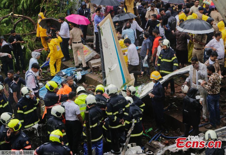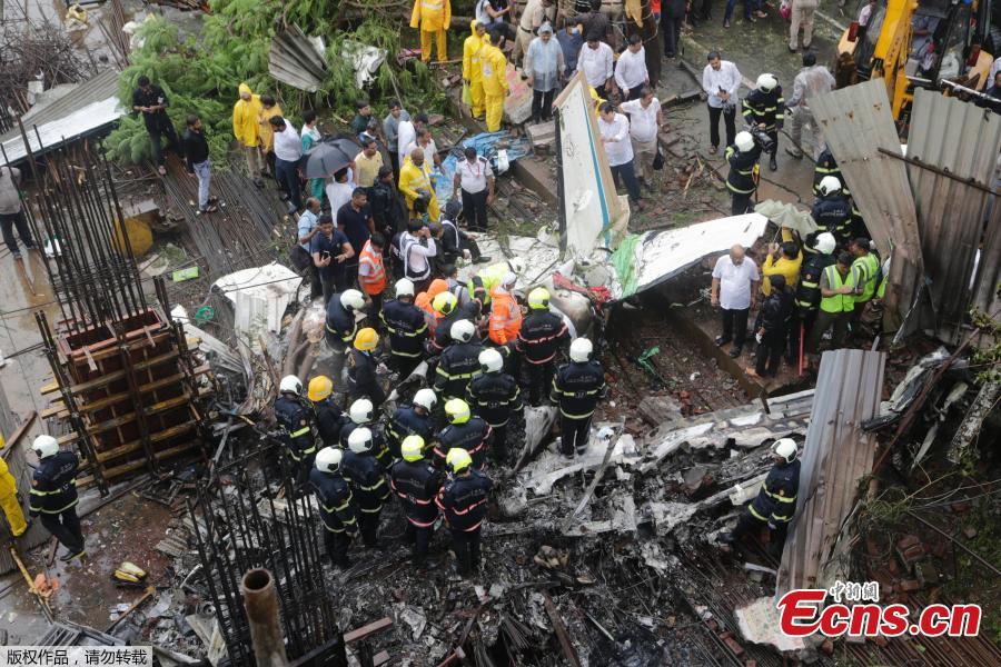 Rescuers stand amid the wreckage of a private chartered plane that crashed in Ghatkopar area, Mumbai, India, June 28, 2018. Five people including one person on the ground were killed. (Photo/Agencies)