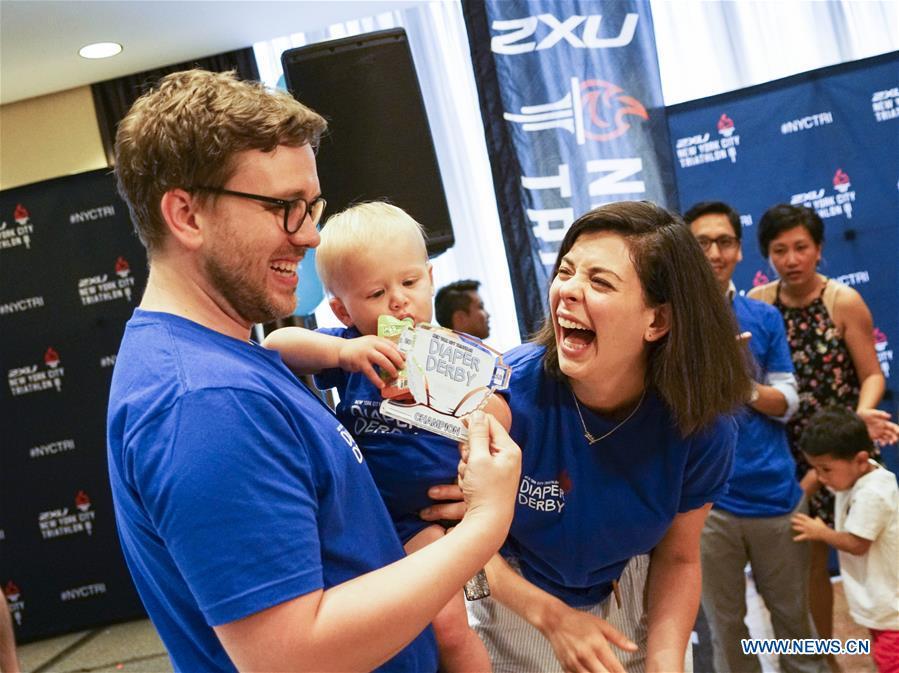 A baby winner and its parents celebrate during the Diaper Derby 2018 in New York, the United States, June 29, 2018. Diaper Derby 2018, a baby crawling contest, was held here on Friday. Around 30 babies competed to crawl across a 12-foot (3.66 meters) long mat. (Xinhua/Lin Bilin)