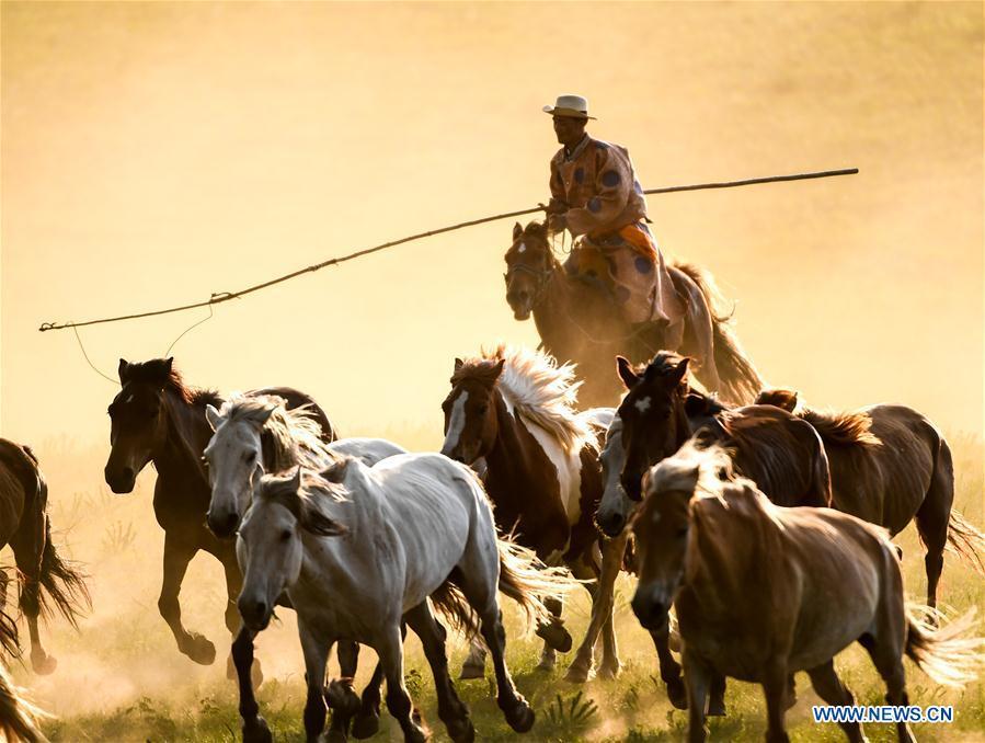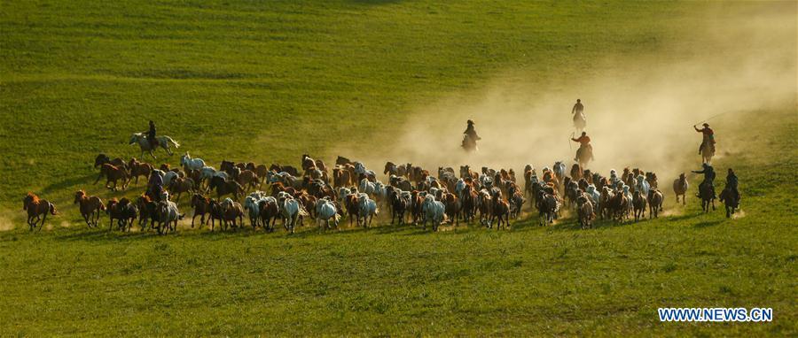 Herdsmen drive horses on a grassland in Hexigten Qi of Chifeng City, north China's Inner Mongolia Autonomous Region, June 29, 2018. (Xinhua/Yu Dongsheng)