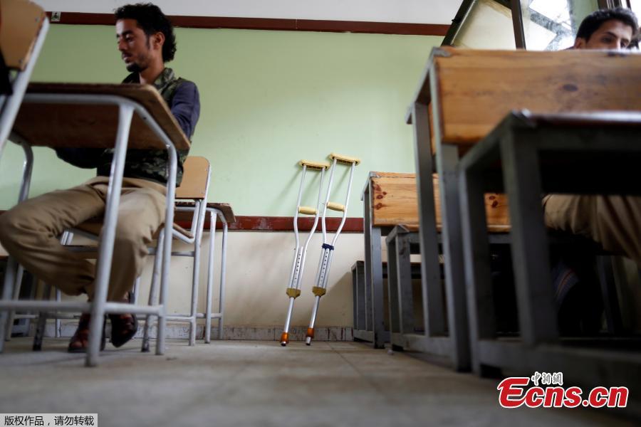 Crutches are seen in a classroom where students are taking their final term exam of high school in Sanaa, Yemen, June 30, 2018. (Photo/Agencies)