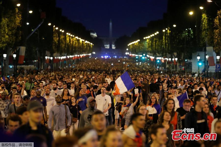 France fans react on the Champs-Elysees in Paris, France, July 10, after defeating Belgium 1-0 in their World Cup semi-final match in St Petersburg. It means the 1998 World Cup winners will play either England or Croatia in the final on Sunday. (Photo/Agencies)