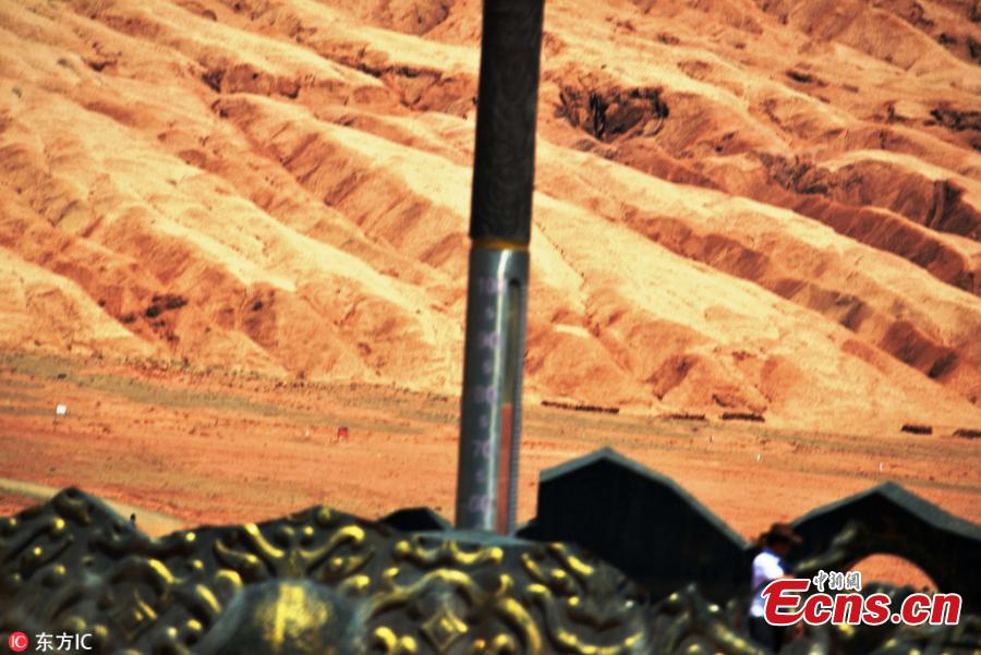 A giant thermometer records ground surface temperature of nearly 80 degrees centigrade at the Flame Mountain Scenic Area in Turpan, Xinjiang Uygur Autonomous Region, July 10, 2018. More than 2,000 tourists a day flocked to the scenic area, 40 kilometers away from downtown Turpan, to challenge the extreme heat. (Photo/IC)