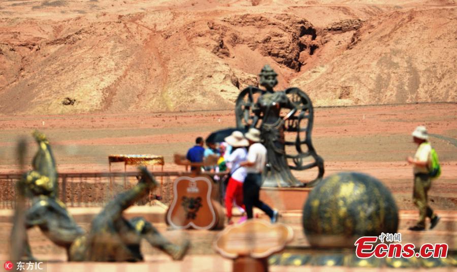 People visit the Flame Mountain Scenic Area in Turpan, Xinjiang Uygur Autonomous Region, July 10, 2018. More than 2,000 tourists a day flocked to the scenic area, 40 kilometers away from downtown Turpan, to challenge the extreme heat. (Photo/IC)