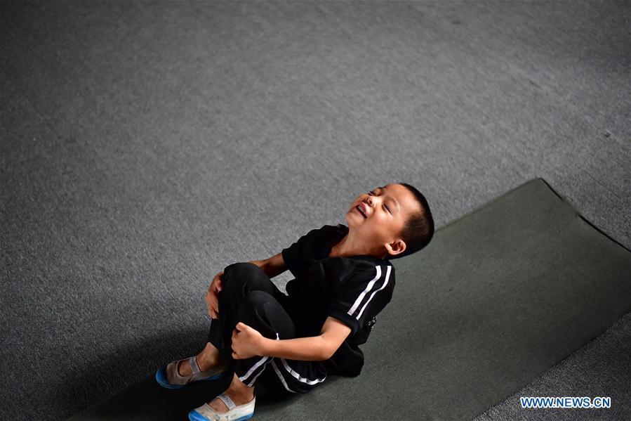 Trainees do warm-up excercises at an acrobatics school in Dongbeizhuang Village of Puyang, central China's Henan Province, July 11, 2018. In Dongbeizhuang Village, an acrobatics school enrols some 40 trainees aged between five and 15 who are faced with financial difficulties. The school offers both skills trainings and academic lessons but charges no tuition fees, preparing the trainees to join larger troupes with greater opportunities. (Xinhua/Feng Dapeng)