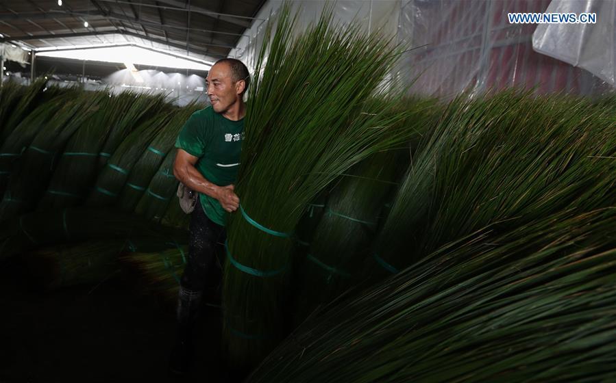 A worker rinses bundled soft rush straws in a factory in Dongpo District of Meishan, southwest China's Sichuan Province, July 13, 2018. Meishan is a major producer and exporter of soft rush (Juncus effusus) in China. The straws of soft rush are widely used as a weaving material for mats and sheets. (Xinhua/Jiang Hongjing)