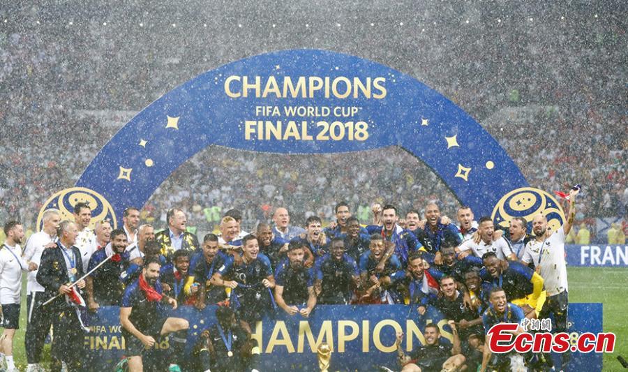 Players of France celebrate at the awarding ceremony after the 2018 FIFA World Cup final match between France and Croatia in Moscow, Russia, July 15, 2018. France defeated Croatia 4-2 and claimed the title. (Photo: China News Service/Fu Tian)