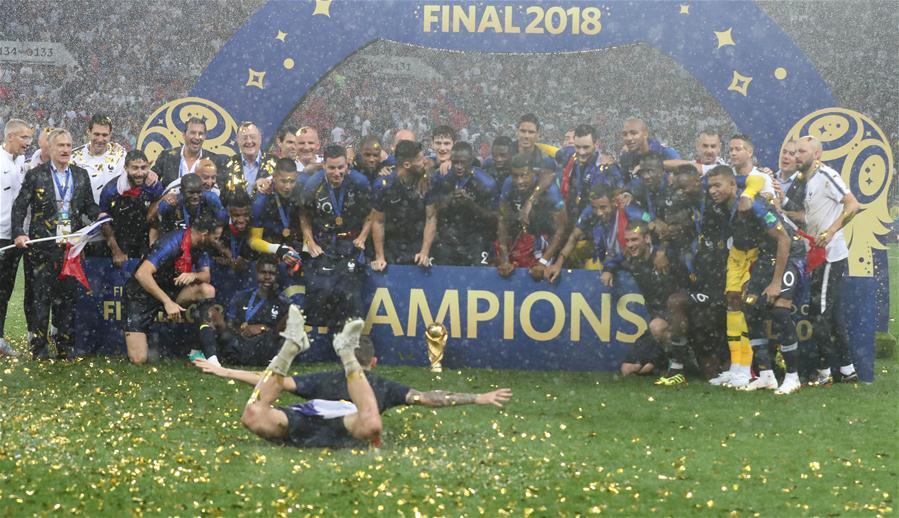 Players of France celebrate at the awarding ceremony after the 2018 FIFA World Cup final match between France and Croatia in Moscow, Russia, July 15, 2018. France defeated Croatia 4-2 and claimed the title. (Xinhua/Cao Can)