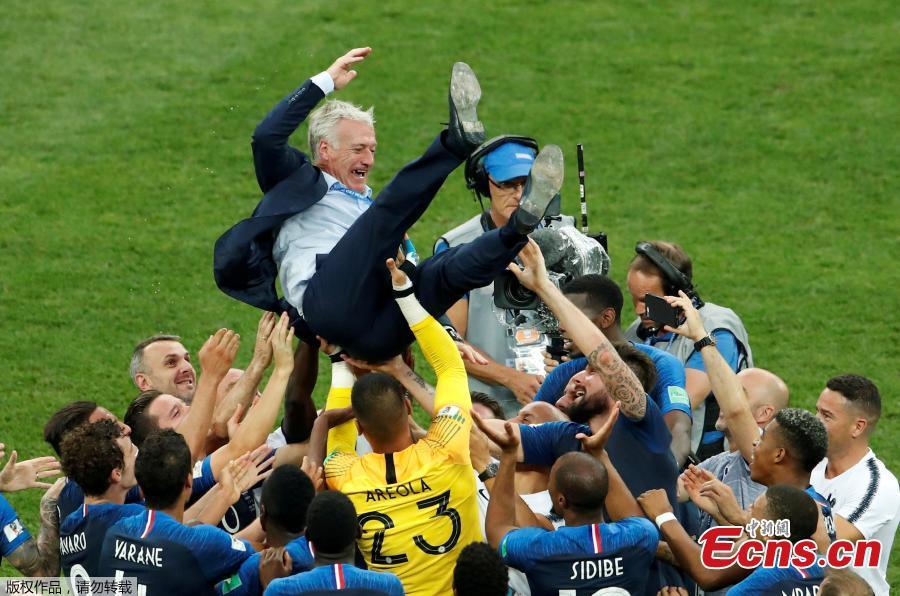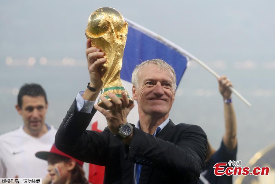 France coach Didier Deschamps celebrates with the trophy after winning the World Cup at Luzhniki Stadium in Moscow, Russia, July 15, 2018. (Photo/Agencies)