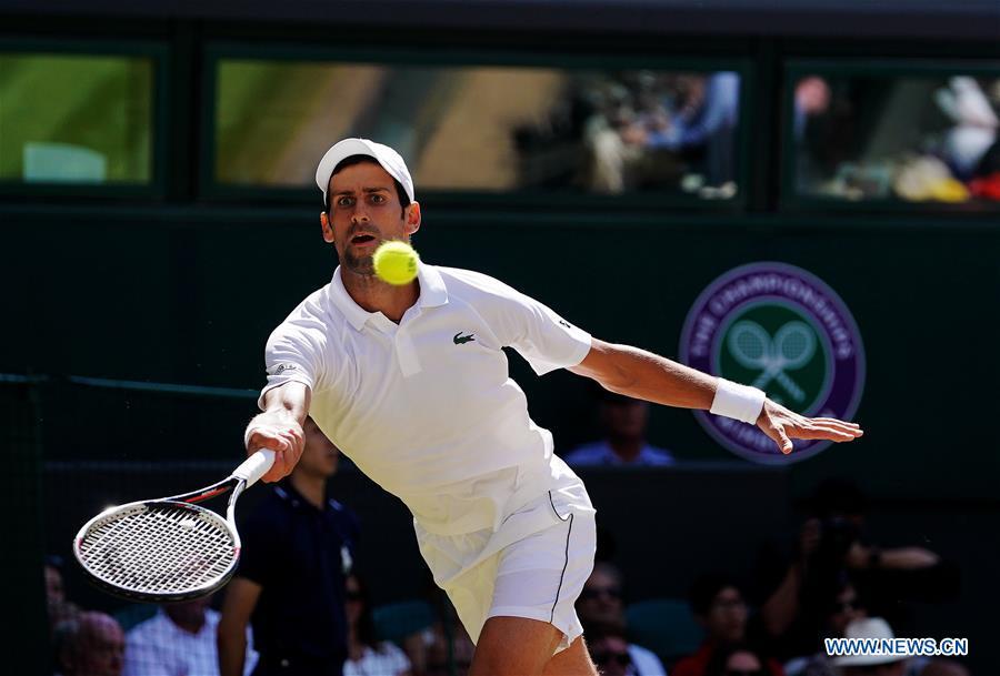 Novak Djokovic of Serbia hits a return during the men's singles final match against Kevin Anderson of South Africa at the Wimbledon Championships 2018 in London, Britain, on July 15, 2018. (Xinhua/Guo Qiuda)