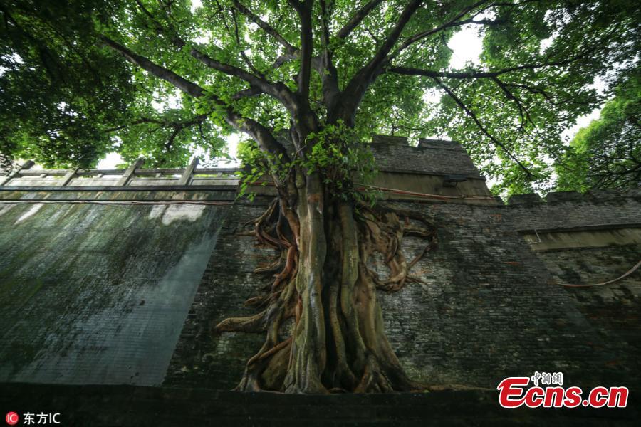 Banyan tree roots spread over remains of a city wall of the Qing Dynasty (1368-1644) near the Yongjiang River Bridge in Nanning City, South China’s Guangxi Zhuang Autonomous Region, July 16, 2018. (Photo/IC)