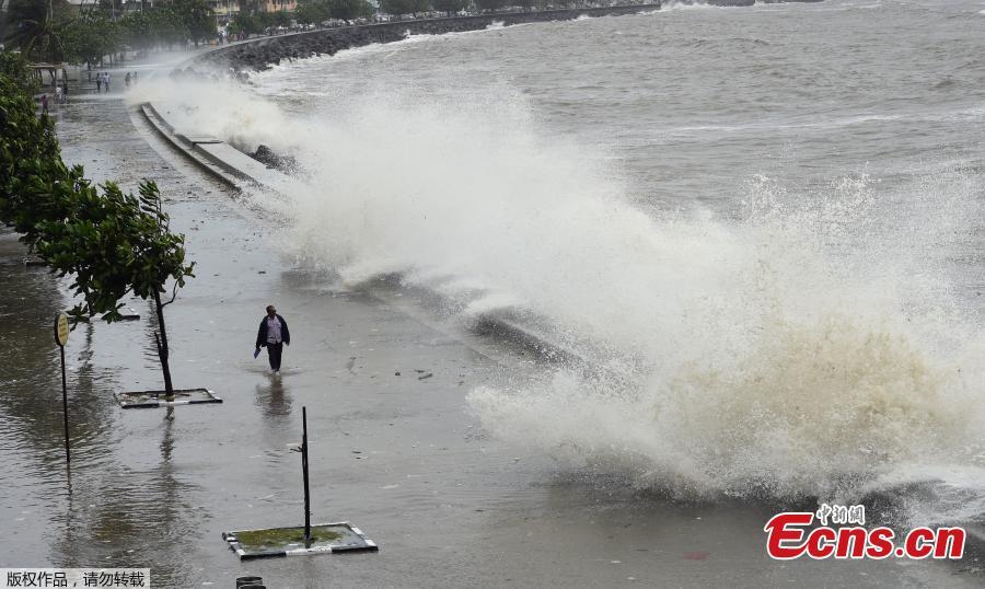 A man walks as a wave crashes during high tide at a sea front in Mumbai, India, July 13, 2018. (Photo/Agencies)