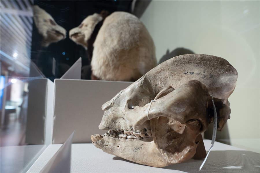 A panda skull is seen at the exhibition. (Photo/China Daily)