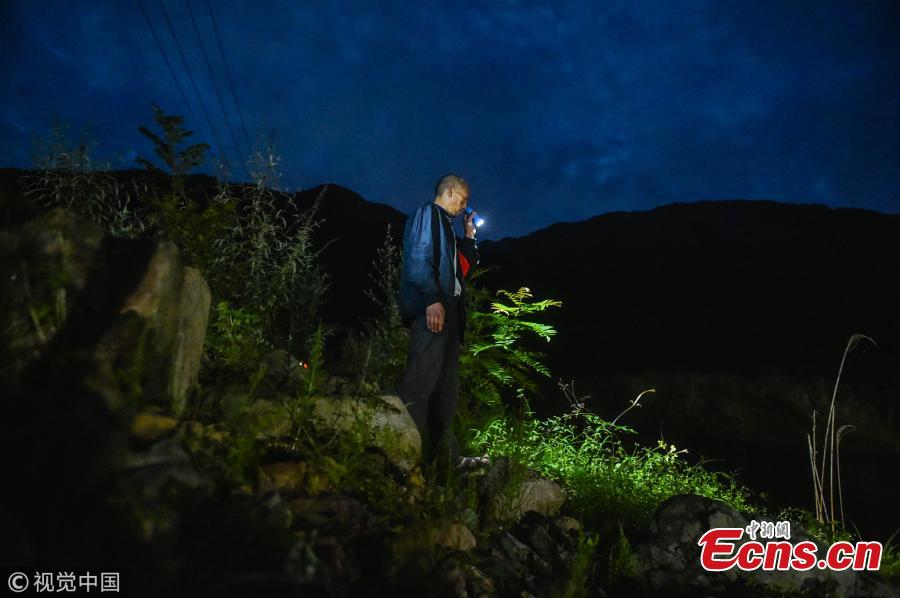 Mou Huaiqing, 65, patrols a valley at night in Dujiangyan City, Southwest China’s Sichuan Province. For the past nine years, since the deadly May 12 earthquake in 2008, Mou and his colleagues have been responsible for 24-hour monitoring of the valley from May to October for signs of potential landslides that could pose a threat to local villagers. They check for any cracks on mountain slopes, for example. Mou helped evacuate 300 residents and tourists in a timely manner as he sounded an alarm to warn of a landslide in August 2010. The team has sounded warnings for a dozen geological hazards. (Photo/VCG)