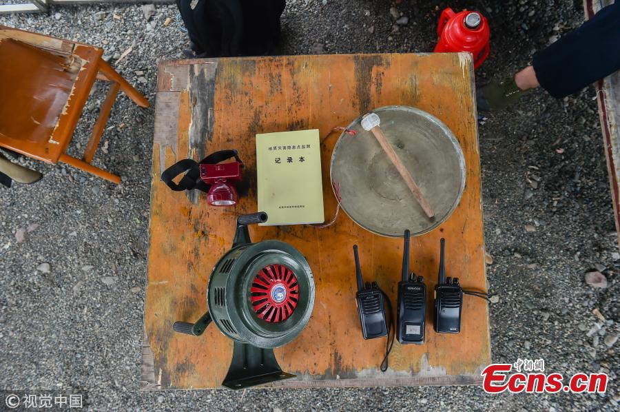 Mou Huaiqing, 65, shows his work equipment including a flashlight and an alarm apparatus in Dujiangyan City, Southwest China’s Sichuan Province. For the past nine years, since the deadly May 12 earthquake in 2008, Mou and his colleagues have been responsible for 24-hour monitoring of the valley from May to October for signs of potential landslides that could pose a threat to local villagers. They check for any cracks on mountain slopes, for example. Mou helped evacuate 300 residents and tourists in a timely manner as he sounded an alarm to warn of a landslide in August 2010. The team has sounded warnings for a dozen geological hazards. (Photo/VCG)