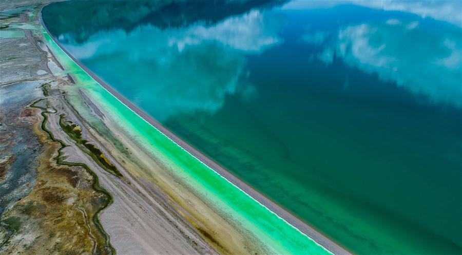Photo taken on June 26, 2017 shows an aerial view of Tangra Yumco Lake in Nagqu, southwest China's Tibet Autonomous Region.(Xinhua/Purbu Zhaxi)