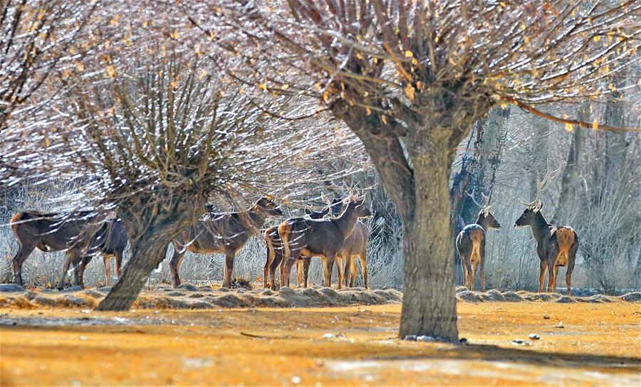 Photo taken on Jan. 6, 2018 shows red deers at an artificial forest in Shannan City, southwest China's Tibet Autonomous Region. (Xinhua/Zhang Rufeng)