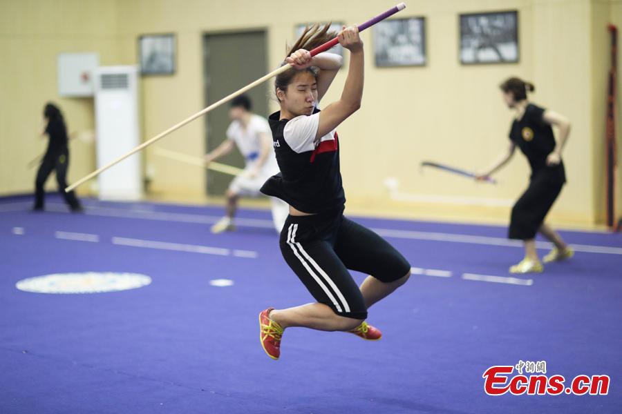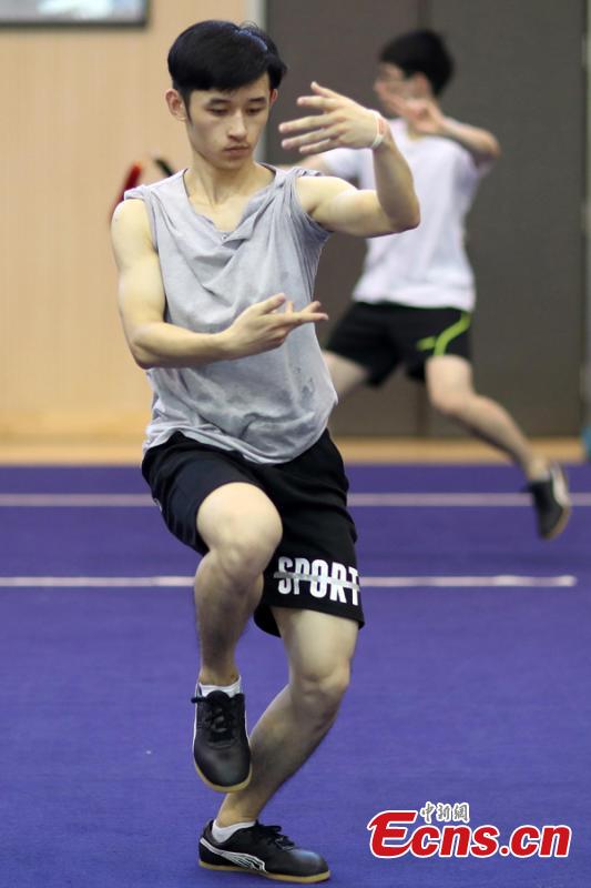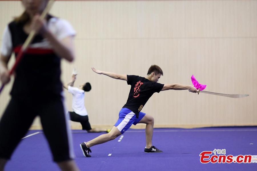 Members of the Nanjing Agricultural University Martial Arts Team train for the upcoming China University Students Martial Arts Routine Championship in Nanjing City, East China's Jiangsu Province, July 19, 2018, as temperatures hit approximately 35 degrees centigrade. (Photo: China News Service/Yang Bo)