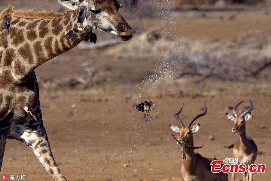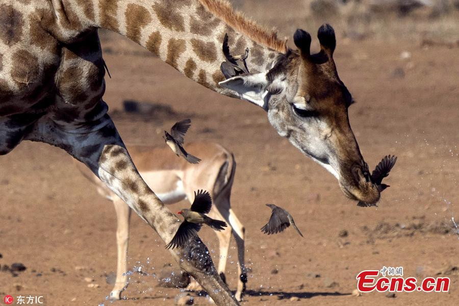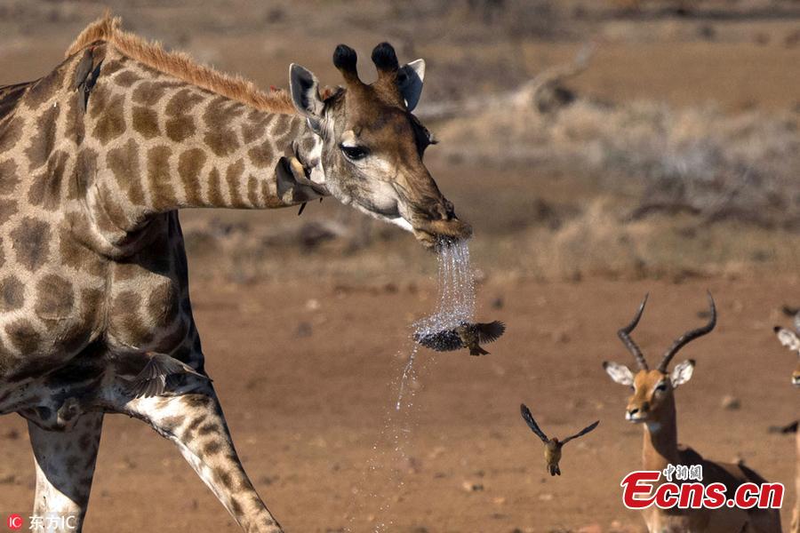 Snaps taken by wildlife photography safari guide and tour operator, Bernhard Bekker, shows an Oxpecker was soaked while flying underneath the drinking giraffe just as water spilled out of its mouth, at Kruger National Park in South Africa. The 41-year-old said the bird was caught in the water spray and looked like it was taking a shower intentionally as it was a very hot day. (Photo/IC)