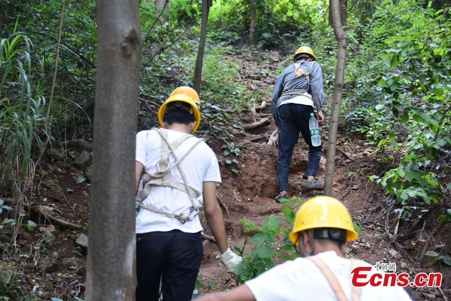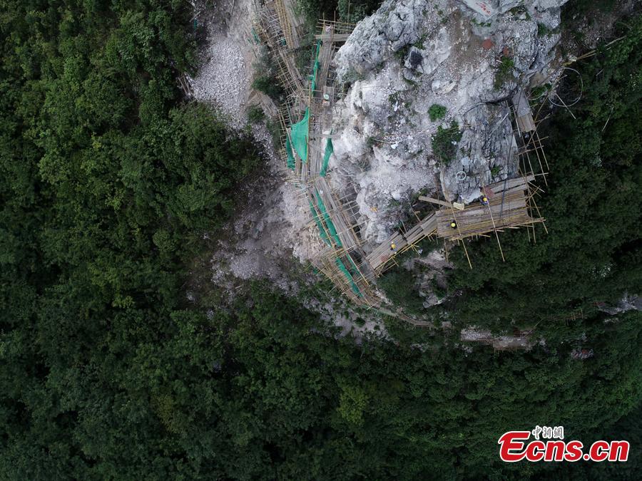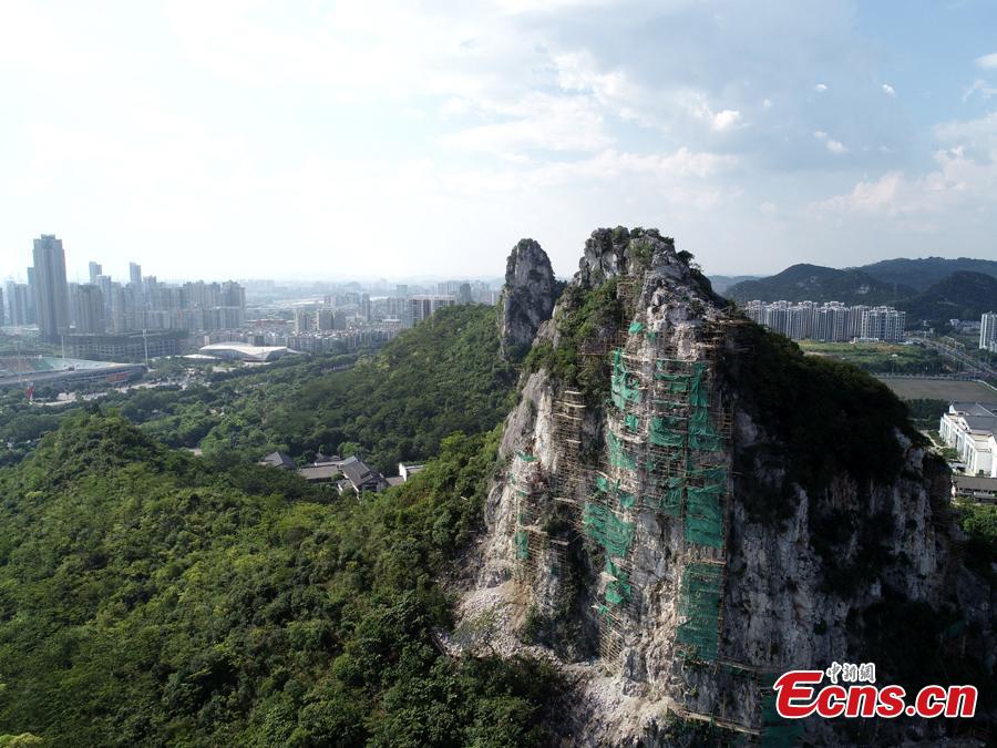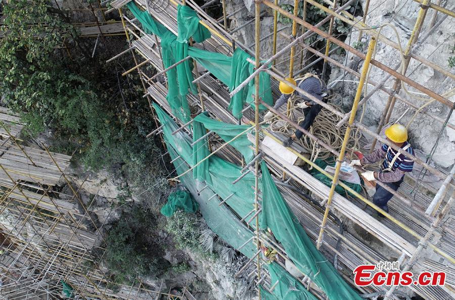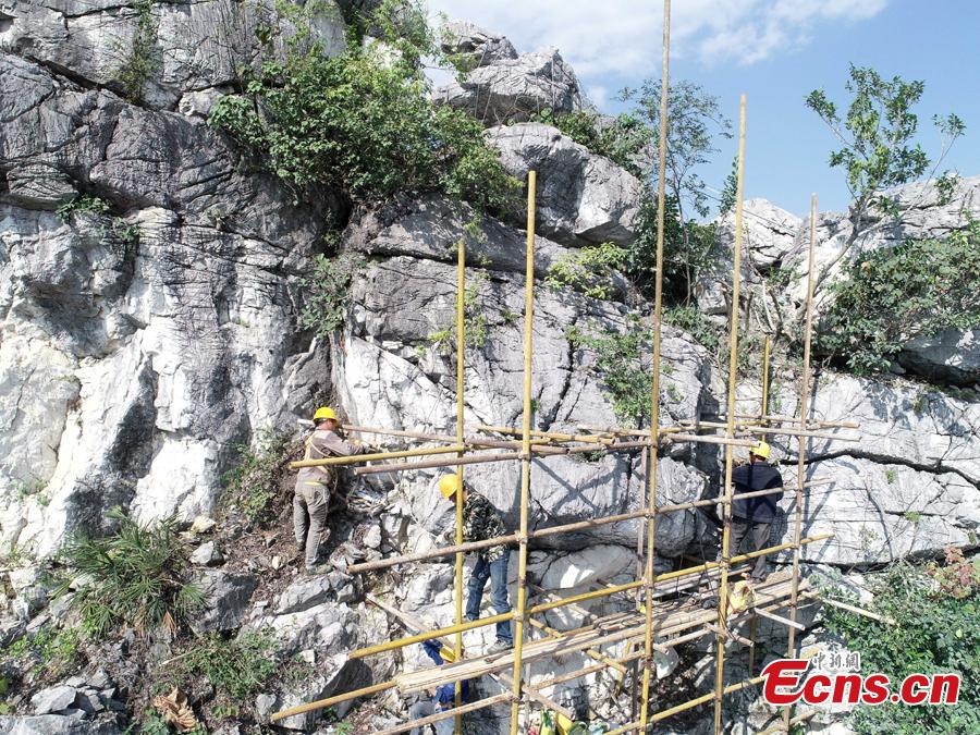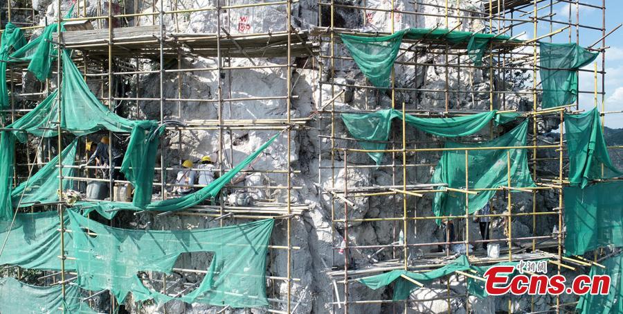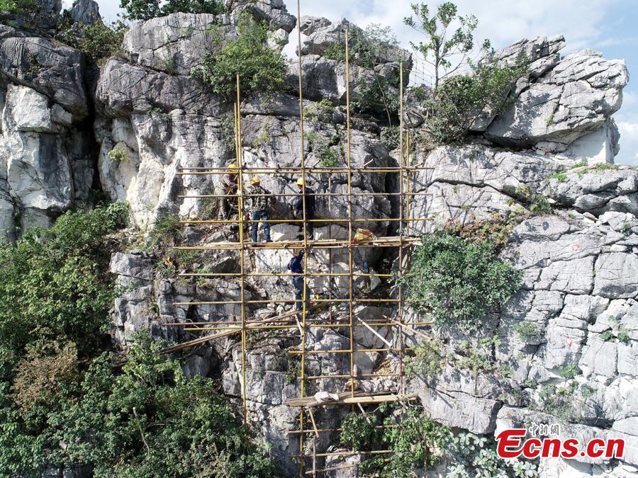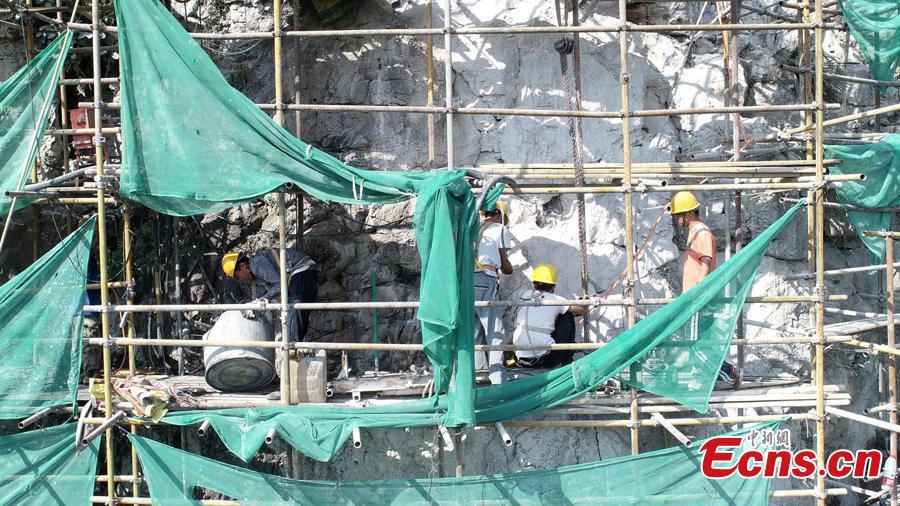 A renovation project is underway to reinforce a 100-meter-high cliff on Malu Mountain in Liuzhou City, South China’s Guangxi Zhuang Autonomous Region, July 19, 2018. Liuzhou, known for its karst formations, allocates funds each year to check and reduce the risks of potential landslides that might threaten local residents. (Photo: China News Service/Wang Yizhao)