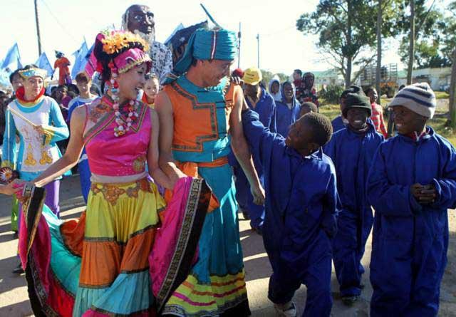 Members of China's Tianjin Performing Art Troupe take part in a parade with local children in Grahamstown, South Africa on July 9, 2011. (Photo/Xinhua)